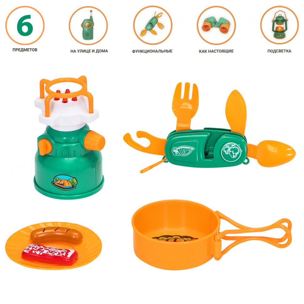Детская посуда игрушка "Набор Туриста" с набором для пикника 6 предметов: примус, складной ножик, сковорода, тарелка, 2 муляжа продуктов