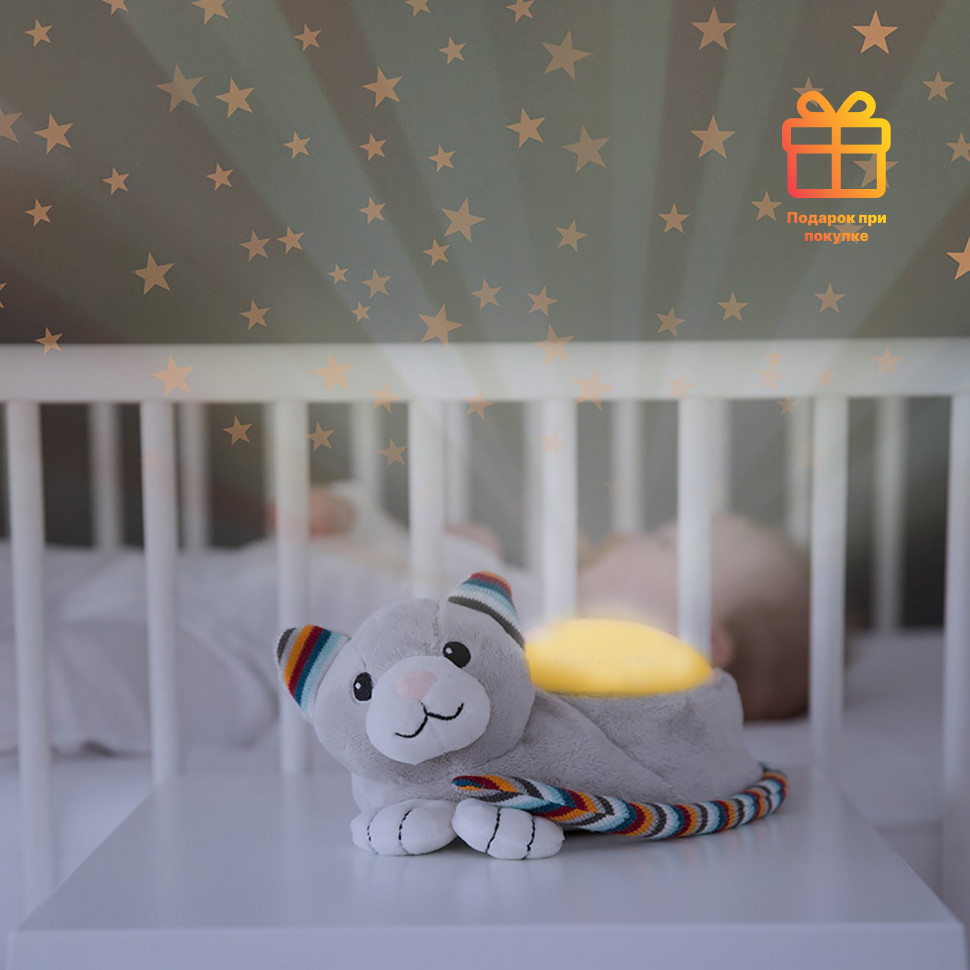 Проектор звездного неба Котенок Кики успокаивает малыша, проецируя на потолок звёздочки 4-х разных цветов: оранжевого, голубого, зелёного и разноцветного.